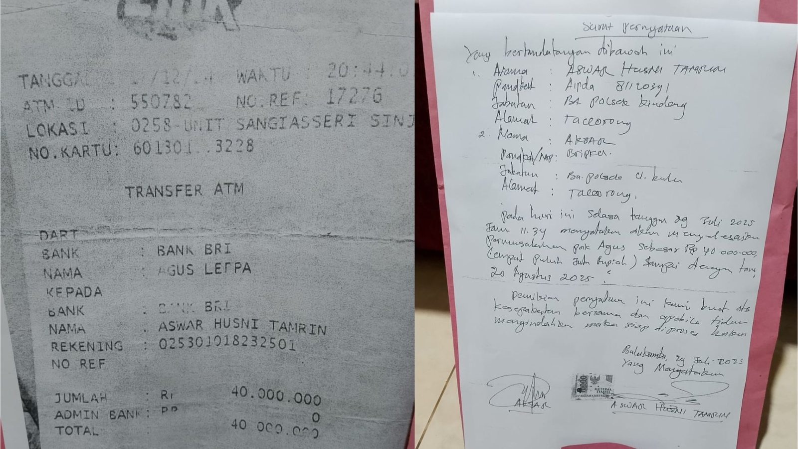 Dalam surat pernyataan bermaterai tersebut, terlapor disebut menyatakan kesanggupan menyelesaikan pembayaran hingga 20 Agustus 2025. Namun hingga kini kewajiban itu disebut belum juga dipenuhi.