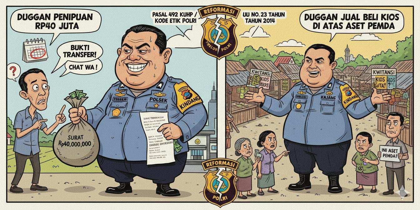 Dugaan penipuan serta praktik jual beli kios di atas aset pemerintah daerah dinilai mencoreng wajah penegakan hukum yang selama ini berusaha dibangun oleh institusi Kepolisian Negara Republik Indonesia.