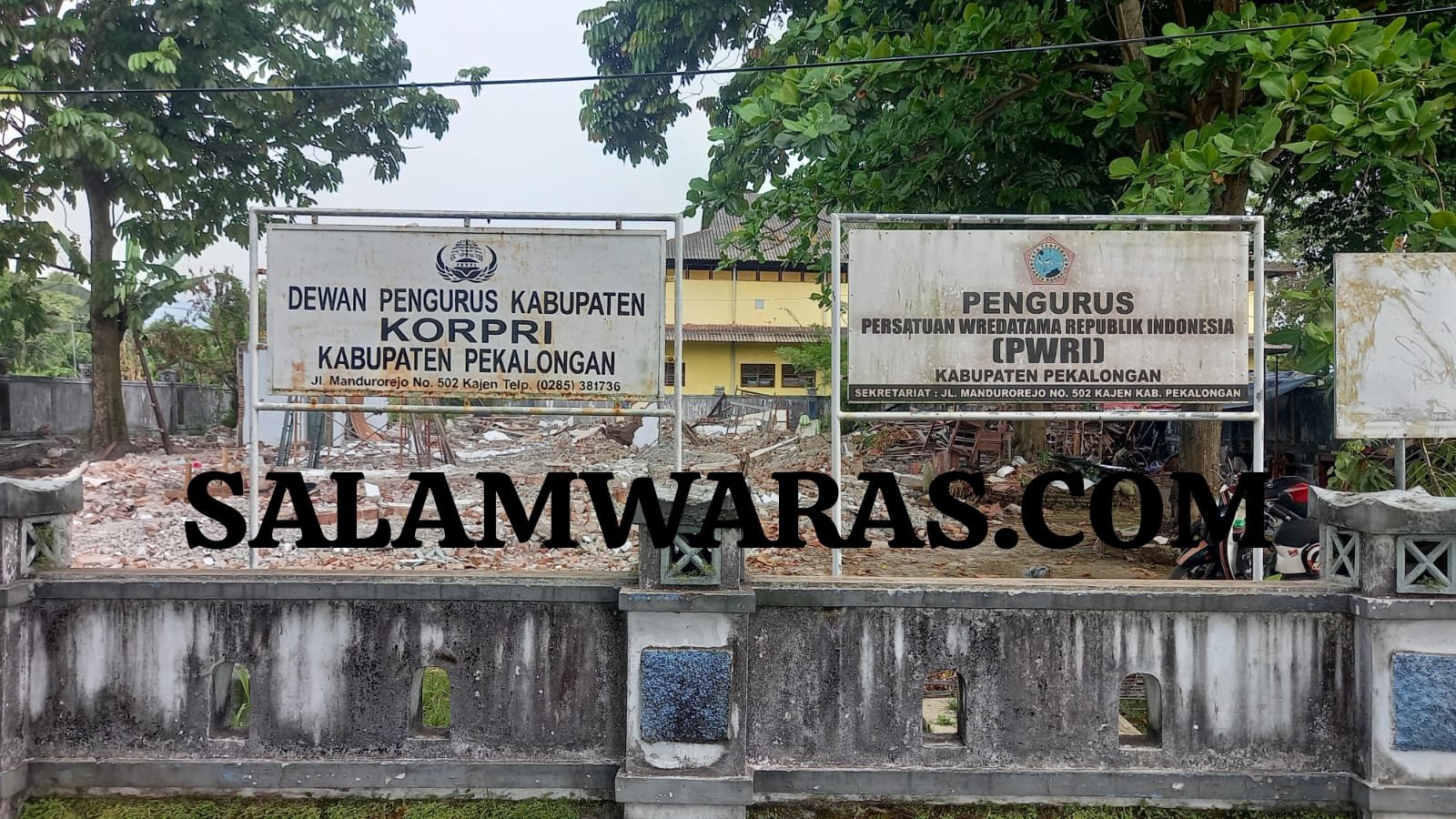 SALAM WARAS, PEKALONGAN — Gedung sekretariat Korps Pegawai Republik Indonesia (Korpri) dan Persatuan Wredatama Republik Indonesia (PWRI) Kabupaten Pekalongan kini rata dengan tanah.