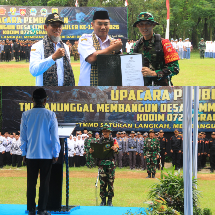 Salamwaras.com, Sragen – Sumarno, S.E., M.M., Sekda Provinsi Jateng secara resmi membuka dimulainya program TMMD reg 128 tahun 2026 Kodim 0725/Sragen di Lapangan Taman Harmoni Plumbungan, Karangmalang, Sragen. Saat menjadi Inspektur upacara, ia memukul kentongan sebagai tanda dibukanya program TNI Manunggal Membangun Desa Reguler ke – 128 di Kabupaten Sragen. Rabu, 22/04/2026.