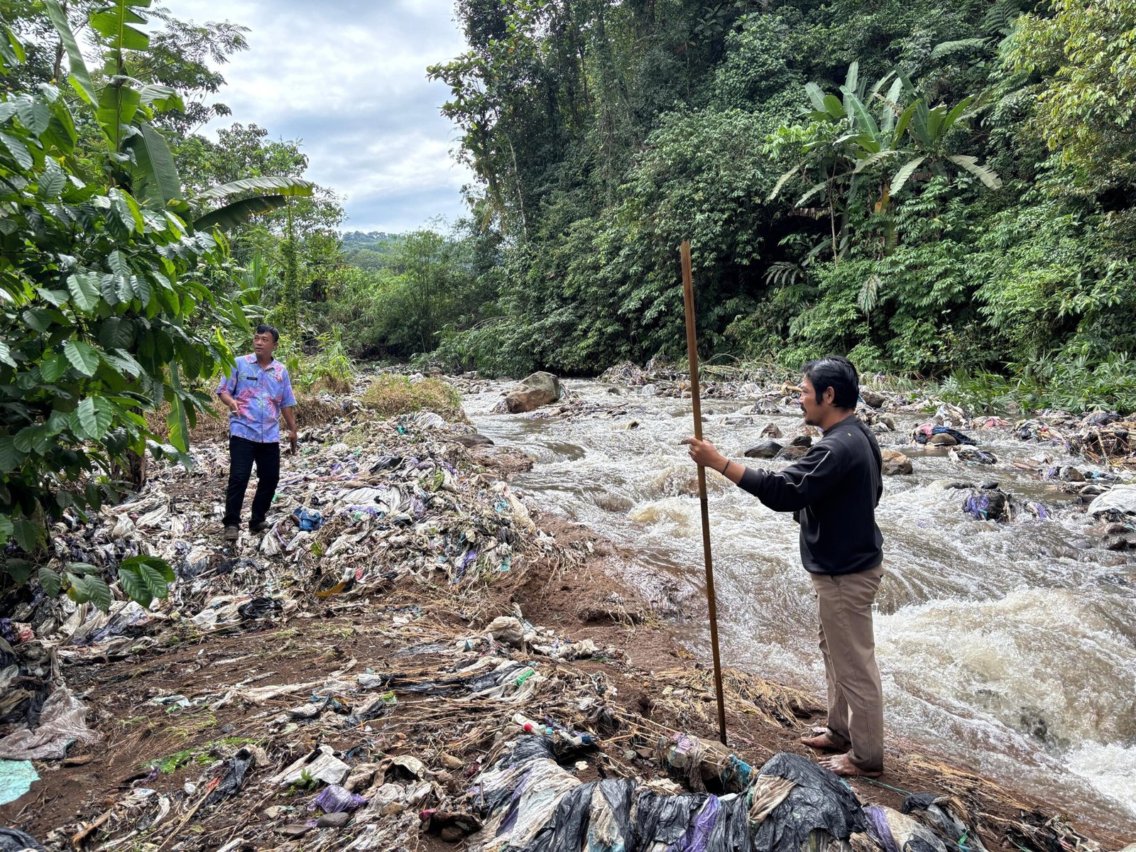 Tim gabungan menyusuri aliran sungai dan area perkebunan yang kini dipenuhi tumpukan sampah plastik disertai bau menyengat.