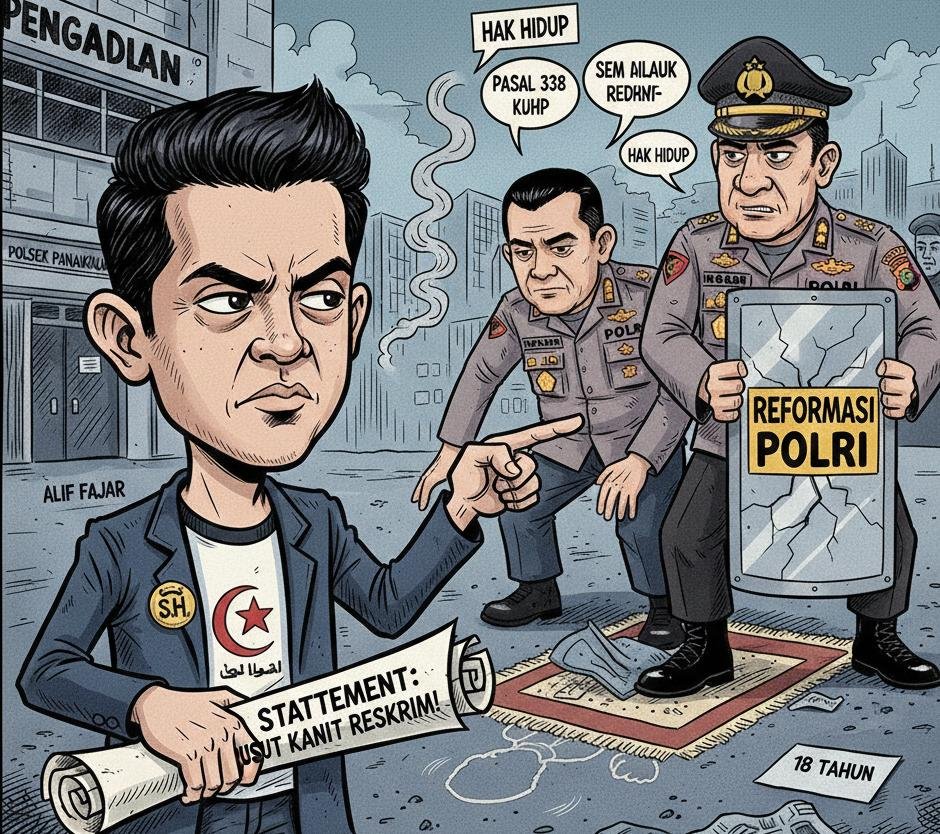 “Supremasi hukum tidak boleh tunduk pada kekuasaan. Tidak boleh ada ruang aman bagi pelanggaran hak hidup. Jika bukti cukup, tetapkan tersangka,” tutup Alif Fajar, S.H.