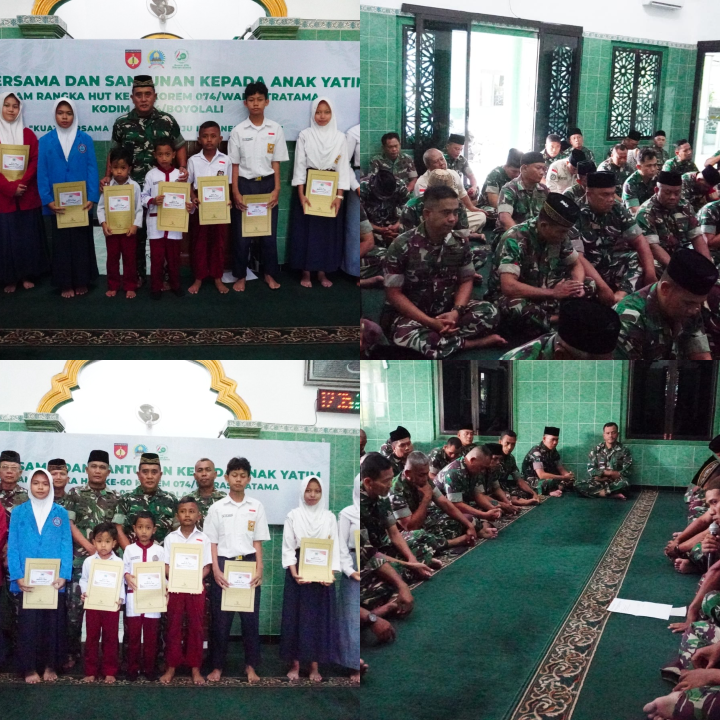 Salamwaras.com, Boyolali – Suasana khusyuk dan penuh kehangatan menyelimuti Masjid Ar-Rahman Makodim 0724/Boyolali, Senin (27/04/26). Dalam rangka memperingati HUT ke-60 Korem 074/Warastratama, keluarga besar Kodim 0724/Boyolali menggelar doa bersama yang dirangkai dengan bakti sosial berupa santunan kepada anak-anak yatim.