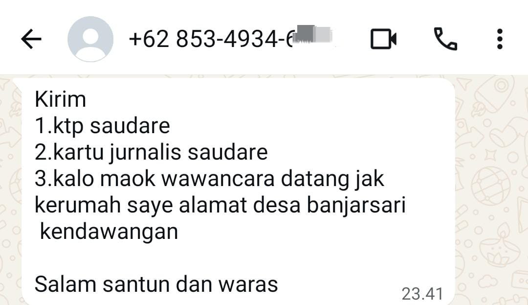 “Kirim 1. KTP saudare, 2. kartu jurnalis saudare. Kalo maok wawancara datang jak ke rumah saye alamat Desa Banjarsari, Kendawangan. Salam santun dan waras,” tulis Nano.