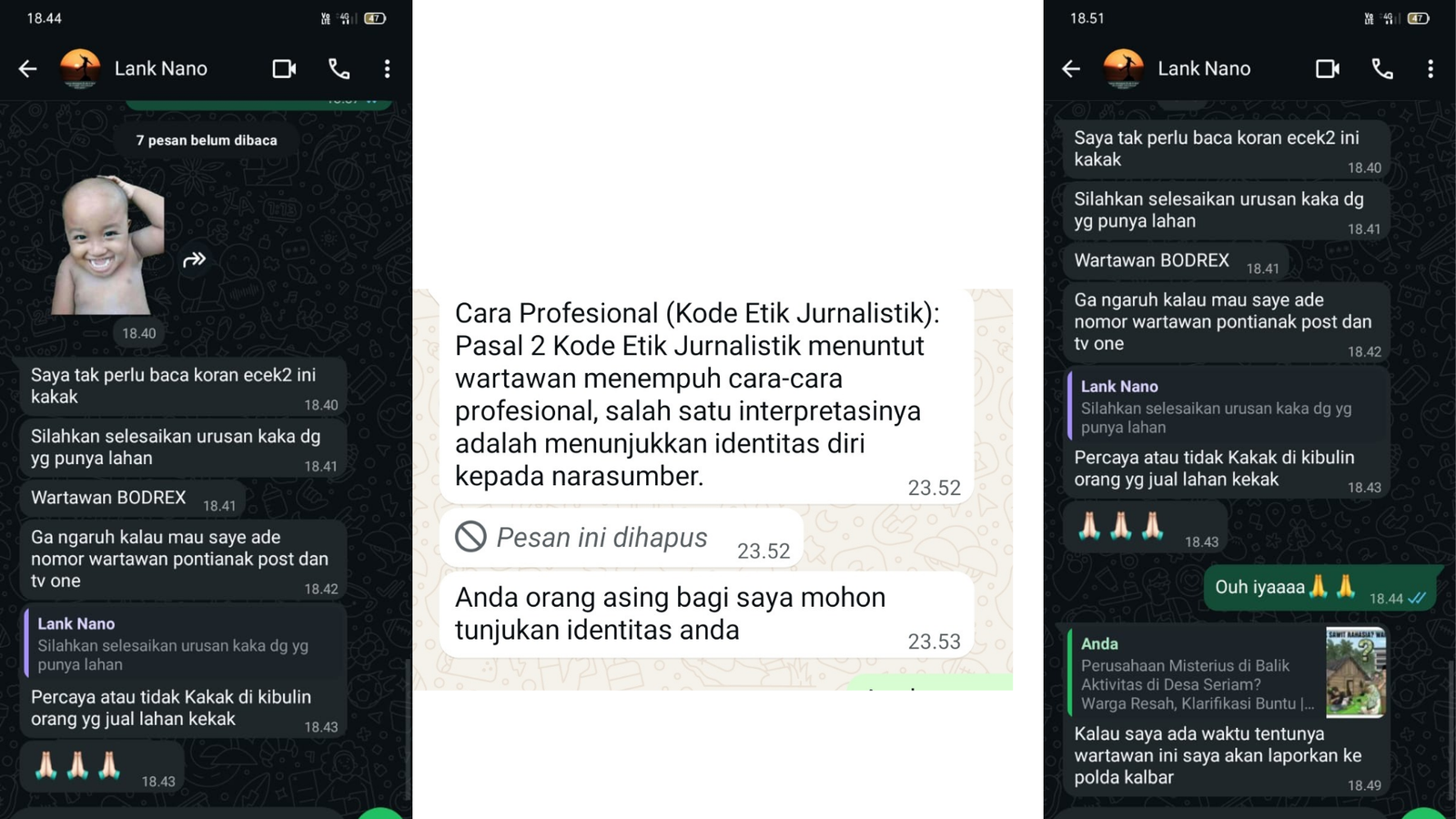 Dalam proses konfirmasi lanjutan, jaringan salamwaras.com kembali menerima sejumlah pesan dari pihak yang sama, Lank Nano, yang bernada merendahkan profesi wartawan serta menolak substansi pemberitaan.