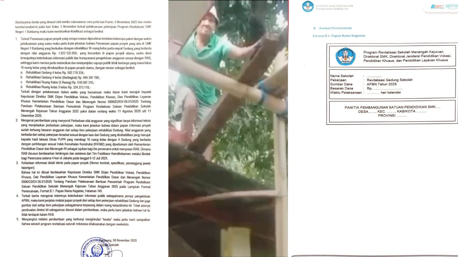 Terkait tudingan minim transparansi karena tidak mencantumkan nomor kontrak dan data teknis lainnya, Samsuddin mengacu langsung pada Lampiran Format B.1 Panduan Revitalisasi SMK 2025 (Halaman 145) yang tidak mewajibkan pencantuman seluruh item detail pada papan proyek.