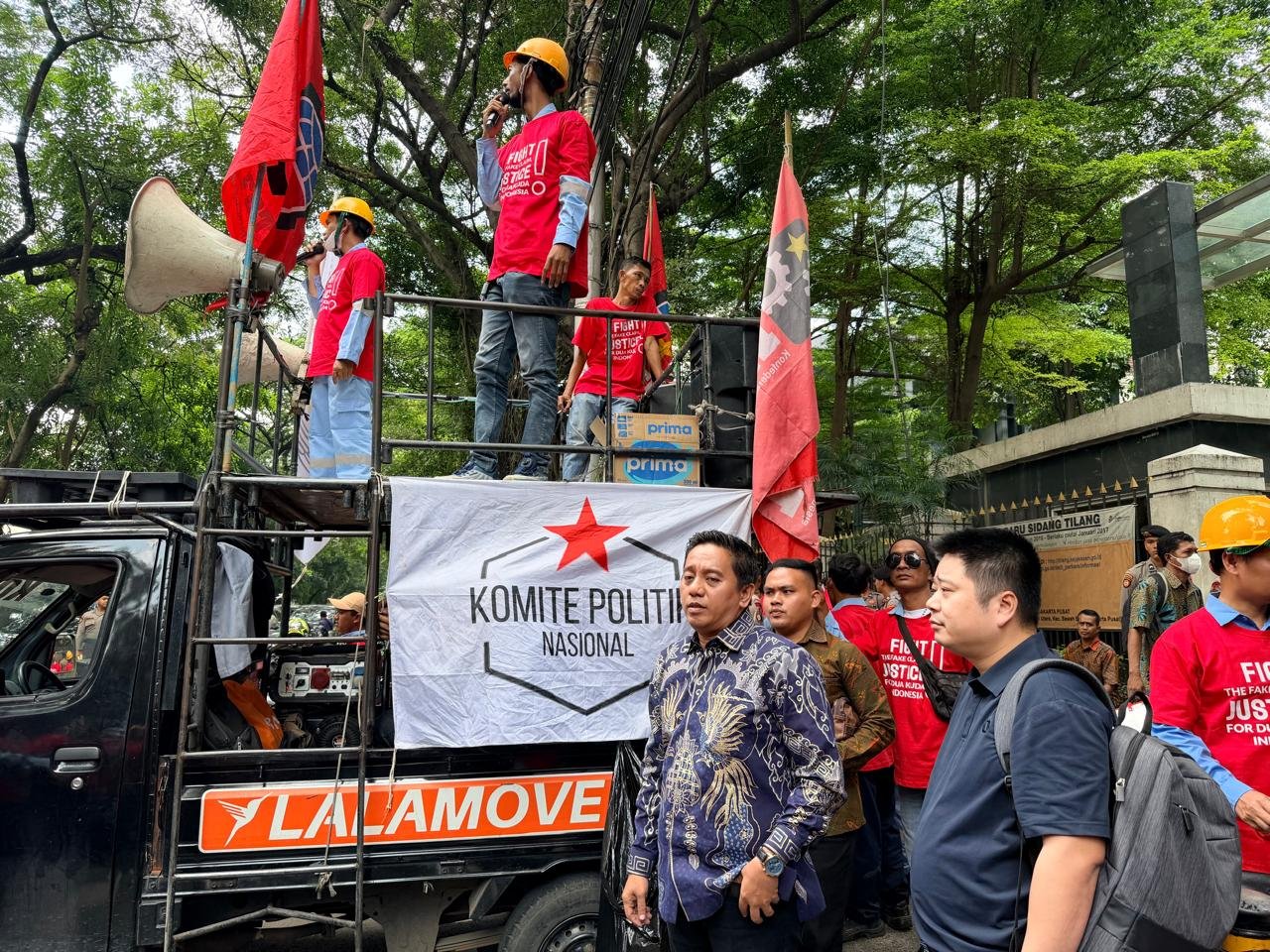 Dalam kesempatan yang sama, Achmad Taufan juga berorasi di hadapan para buruh dan pekerja PT Dua Kuda Indonesia yang hadir memberikan dukungan moril di area sekitar pengadilan. Tim Kuasa Hukum membakar semangat para pekerja yang turut mendampingi jalannya persidangan.