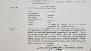 Pemanggilan Andi Arif, ahli waris almarhum Haji Taman Bin Yanbo, oleh Direktorat Reserse Kriminal Umum (Ditreskrimum) Polda Sulawesi Selatan, menimbulkan banyak tanda tanya. Rabu 8 Oktober 2025.