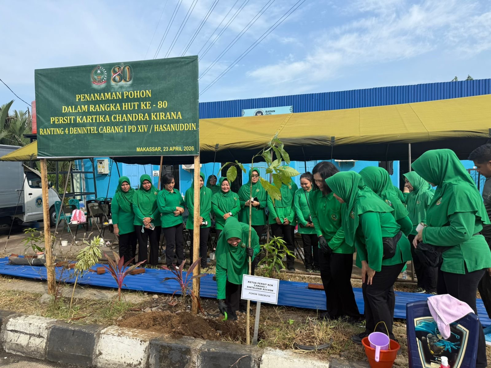 MAKASSAR – Dalam rangka memperingati Hari Ulang Tahun (HUT) Persit Kartika Chandra Kirana ke-80, Persit KCK Cabang 1 Ranting 4 Denintel menggelar kegiatan penanaman pohon serentak di Jalan Dr Leimena, Kelurahan Tello Baru, Kecamatan Panakukang, Kota Makassar, Kamis (23/4/2026) pagi.