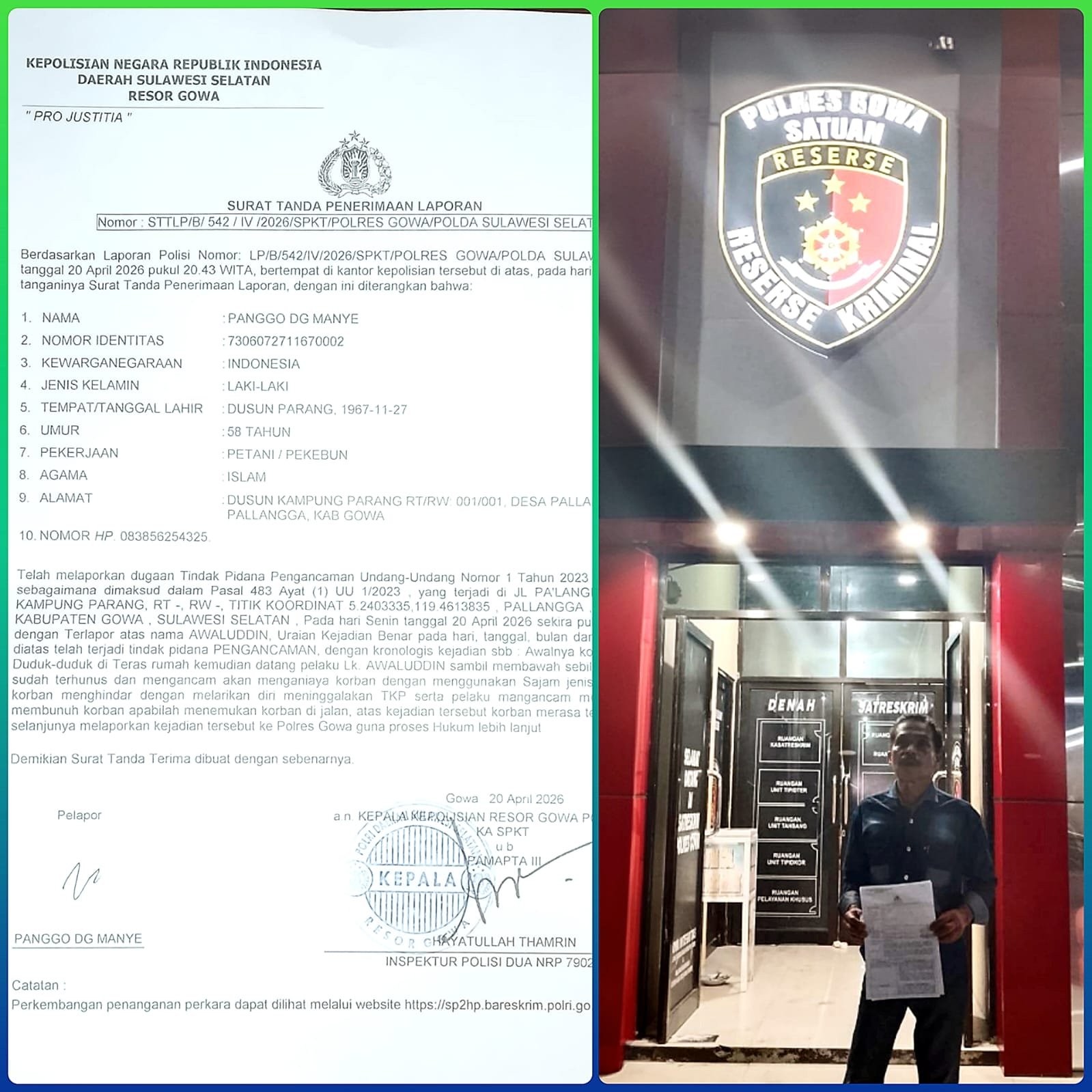 Laporan tersebut tercatat dengan Nomor: LP/B/542/IV/2026/SPKT/Polres Gowa/Polda Sulawesi Selatan, yang diterima pada Senin, 20 April 2026, pukul 20.43 WITA di Kantor Polres Gowa.
