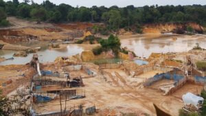 Di balik suara mesin, pemandangan yang tersaji kian memprihatinkan. Tanah datar berubah menjadi kubangan besar penuh air keruh, menunjukkan pengerukan yang berlangsung terus-menerus.