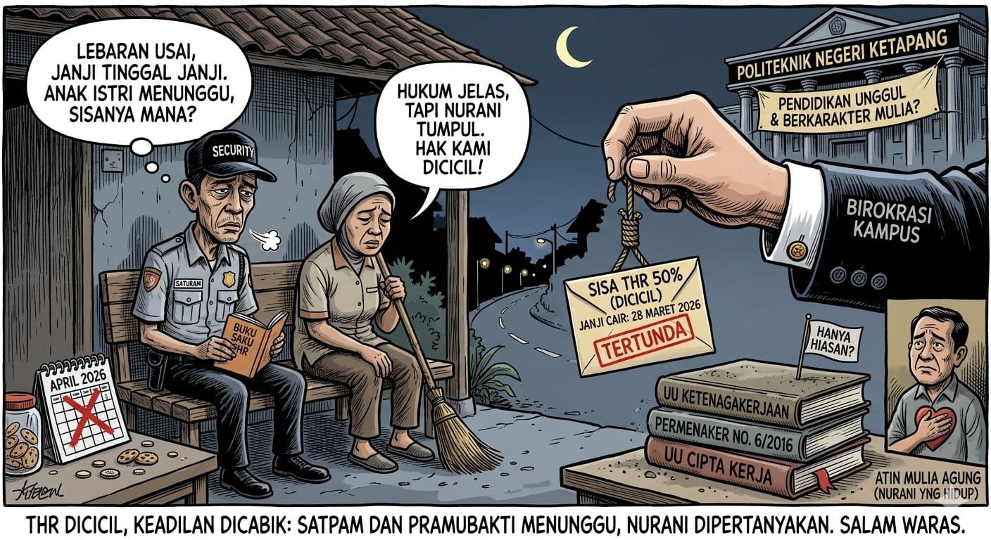 Salam Waras, Ketapang — Di balik gemerlap perayaan Idul Fitri 1447 Hijriah, ada sunyi yang menggantung di dada para satpam dan pramubakti di Politeknik Negeri Ketapang.