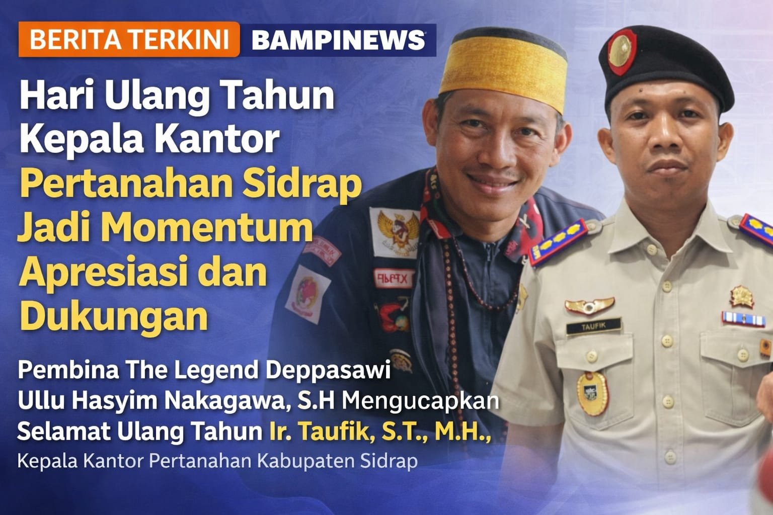 Sidrap — Ir. Taufik, S.T., M.H., M.Si., QRMP, Kepala Kantor Pertanahan Kabupaten Sidenreng Rappang (Sidrap), menerima ucapan selamat ulang tahun dari berbagai kalangan sebagai bentuk apresiasi atas dedikasi dan pengabdiannya dalam menjalankan tugas di bidang pertanahan.